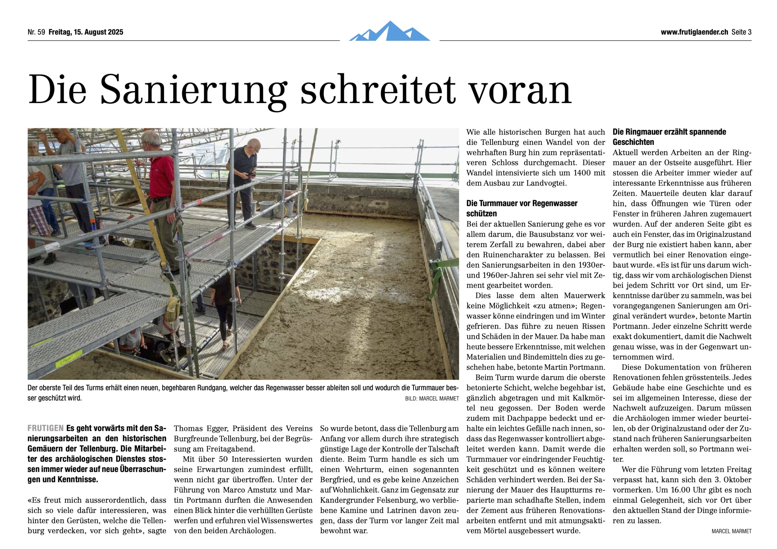 Die Bausaison 2025 geht langsam ihrem Ende entgegen, Aktuell wurden die Sanierungsarbeiten an den Aussenmauern beendet, die Burg steht also wieder ohne Aussengerüste und ohne Dach da. Wer mehr darüber wissen will, sollte die öffentliche Besichtigung gemeinsam mit Vertretern des Archäologischen Dienstes des Kantons Bern am 3. Oktober 2025 nicht verpassen (16 Uhr bei der Tellenburg. Parkplatz: Schützenhaus oder Rybrügg).
