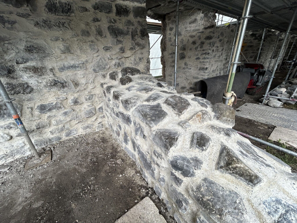 Blick auf den freigelegten Rundgang des Tellenburg-Turms, wo unter einem Dach die Sanierungsarbeiten voll im Gang sind. Bild: ZVG